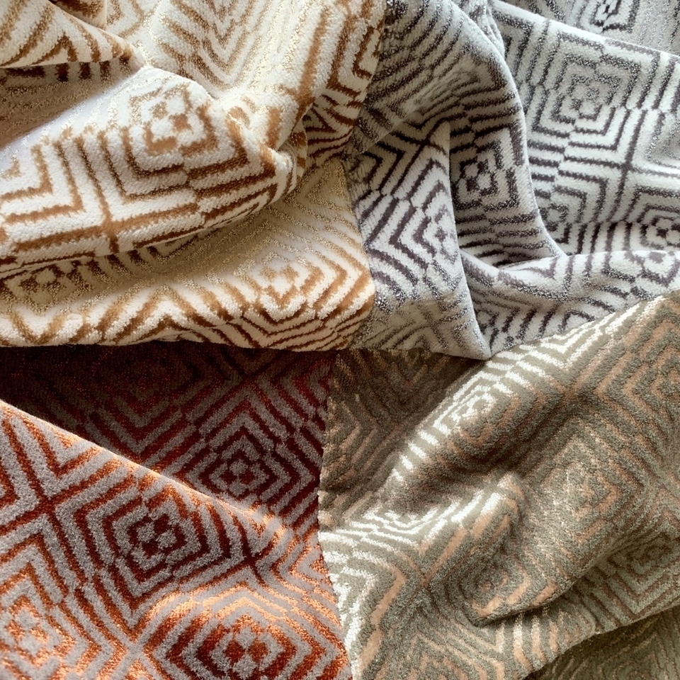 Особое внимание заслуживают компаньоны, весьма неожиданные в данной коллекции- графический 3D ромб и полоса-ёлочка, они могут выгодно обыграть основной вензель в изделии. А также использоваться как совершенно самодостаточные элементы или в сочетании с однотонными велюрами , шениллами и жаккардами.