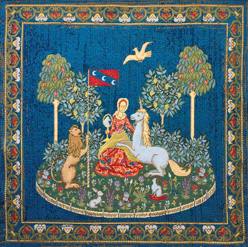 Сюжетный гобелен Дама с единорогом, рапорт 70х70 см. Этот гобелен включает в себя все 6 сюжетов знаменитых шпалер: Осязание, Слух, Зрение, Вкус, Обоняние. По моему единственному желанию.