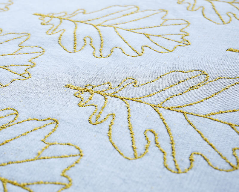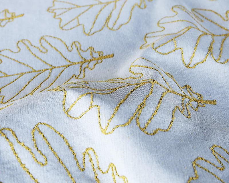 Букле с изображением дубового листа создана в двух интерпретациях: на светлом хлопковом поле - Лукоморье и на цветном фоне - Дубрава. Дополнением к нашей коллекции мебельной ткани букле создан однотонный компаньон, как обычно, к каждому из предложенных цветов.