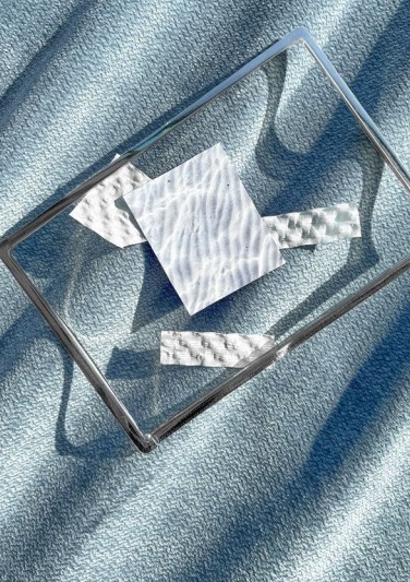 Флисовая подложка дает пластичность: ткань легко драпируется, облегает любые формы и создает тактильный объем. Шевронный узор добавляет строгим силуэтам визуальную глубину, разбивая монотонность больших поверхностей..