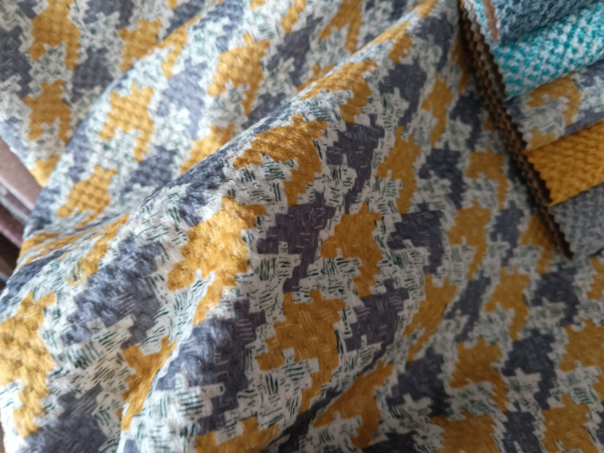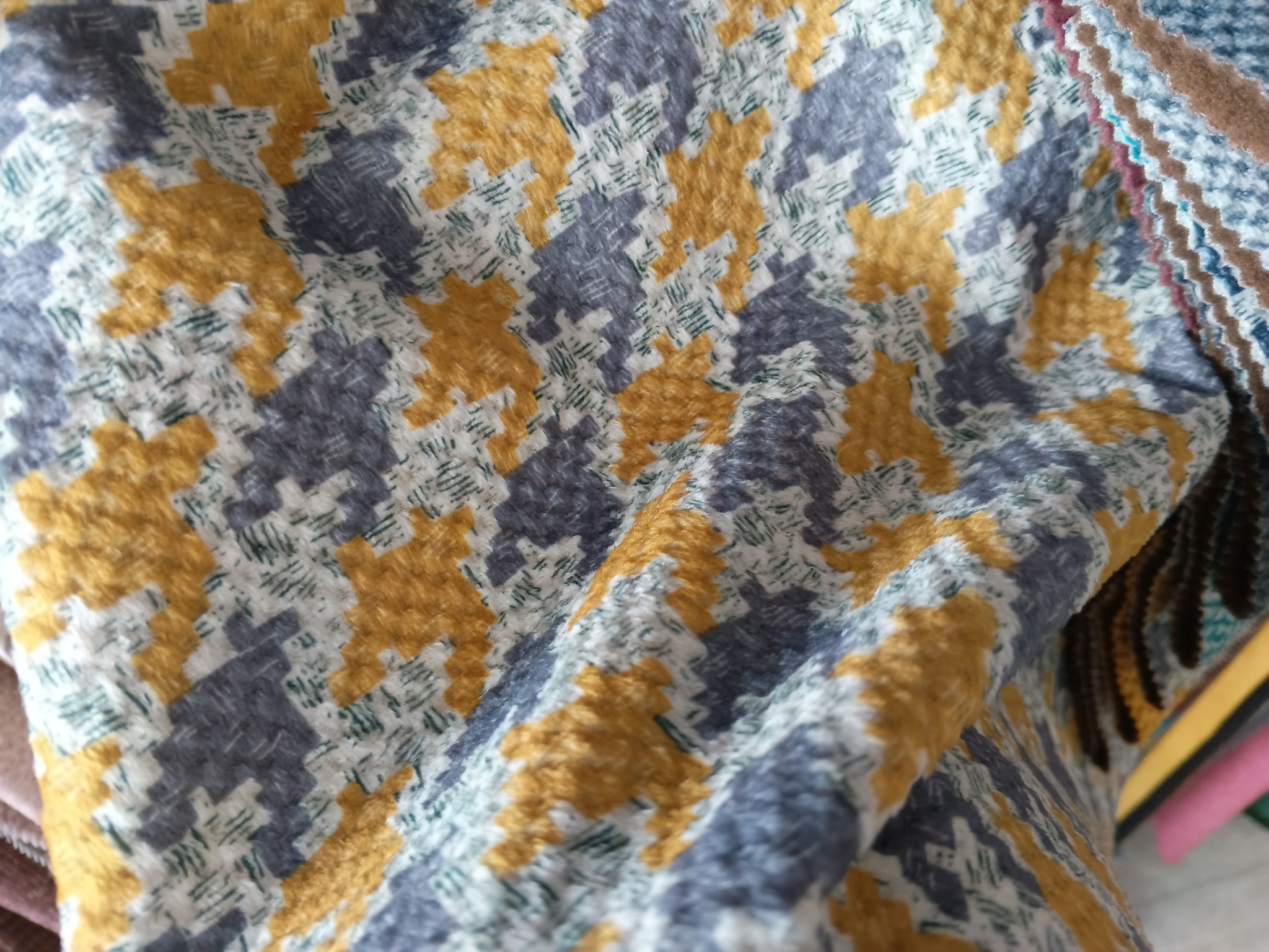 Плотный пёстрый велюр Sigma (Сигма) с тиснением. В коллекции также представлен компаньоном с узором "гусиная лапка".