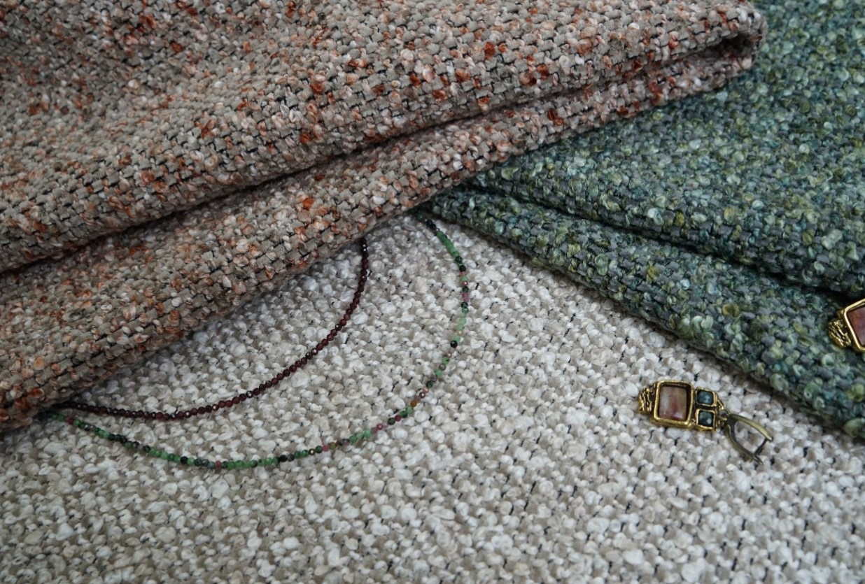 Коллекция Tesoro (Тесоро) как ценная шкатулка собрала в себе все многообразие столь популярной буклированной текстуры. Она искусно повторяет необыкновенные фактуры самоцветов и драгоценных камней. Переплетение сразу несколько нитей, выкрашенных и обработанных определенным способом, образует целый ансамбль красивых и сложных оттенков, которые в точности имитируют всю глубину и привлекательность натуральных камней.