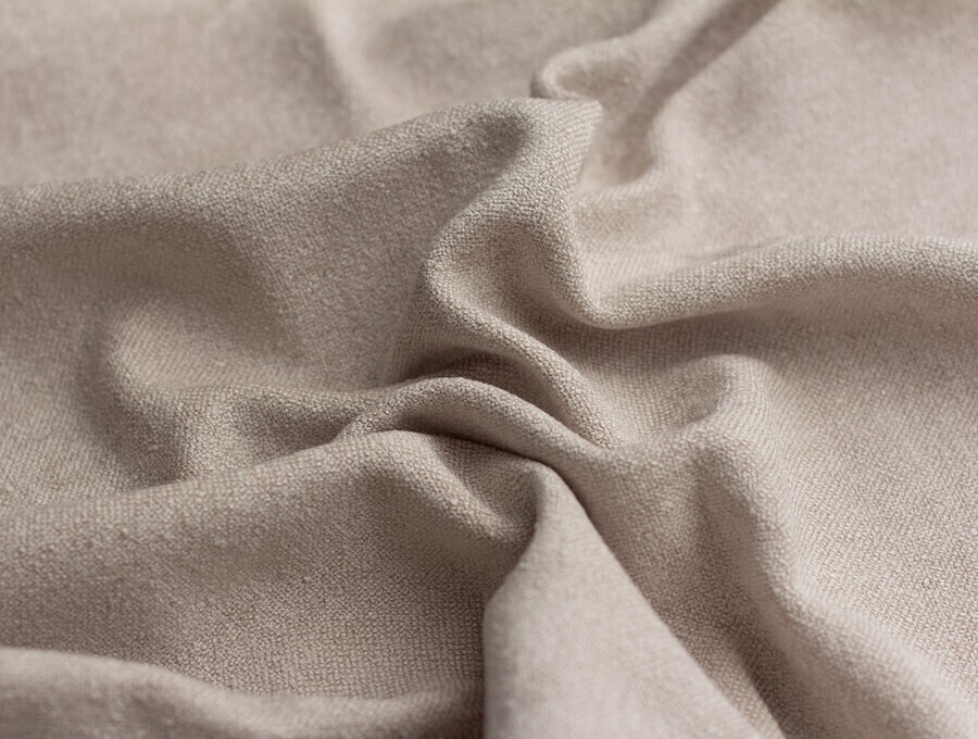 Фактура этого материала буквально усыпана узелками букле, которые, как крошечные жемчужинки, мягко отражают свет. При этом на ощупь материал очень бархатистый, после прикосновения к поверхности ощущается по-настоящему шенилловая мягкость.