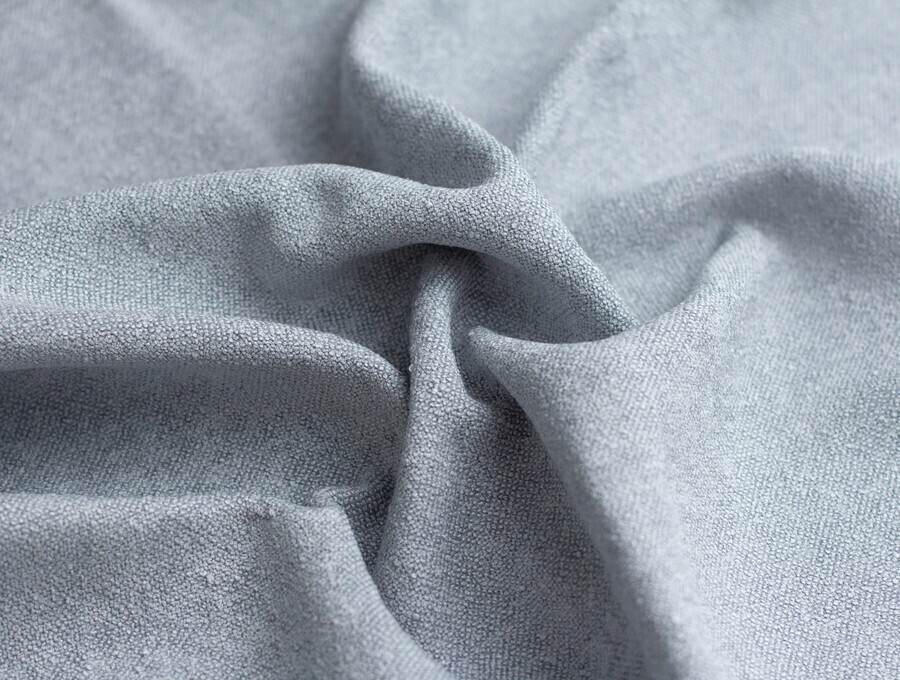 Фактура этого материала буквально усыпана узелками букле, которые, как крошечные жемчужинки, мягко отражают свет. При этом на ощупь материал очень бархатистый, после прикосновения к поверхности ощущается по-настоящему шенилловая мягкость.