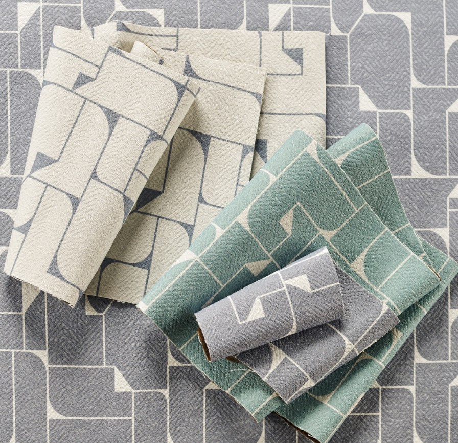 Объемная фактура жаккардового поля со стилизованным шевроном создает расслабленную атмосферу в интерьере. А геометрия четких линий придает изделиям визуальную считываемость и живость, отсылая к вновь трендовым 70-м.